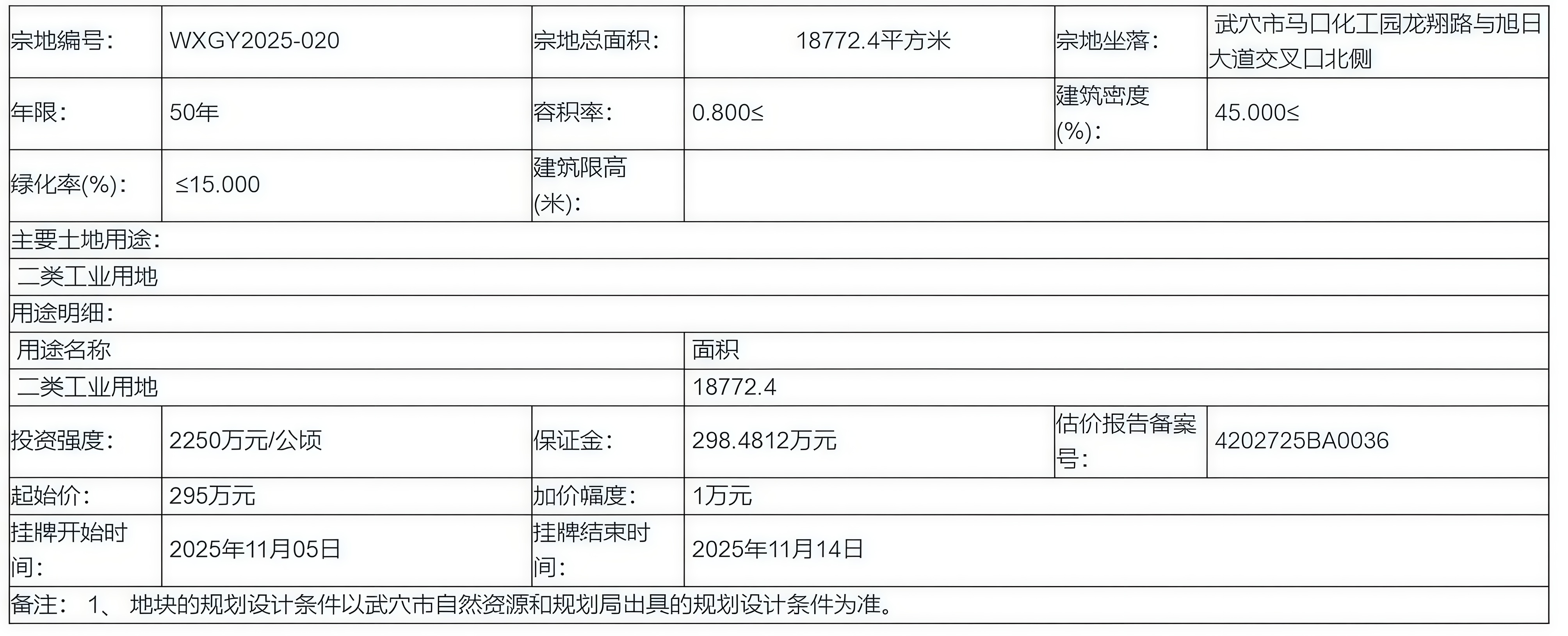 WXGY2025-020 号地块:2025年11月05日 08时00分 至 2025年11月14日 10时00分;