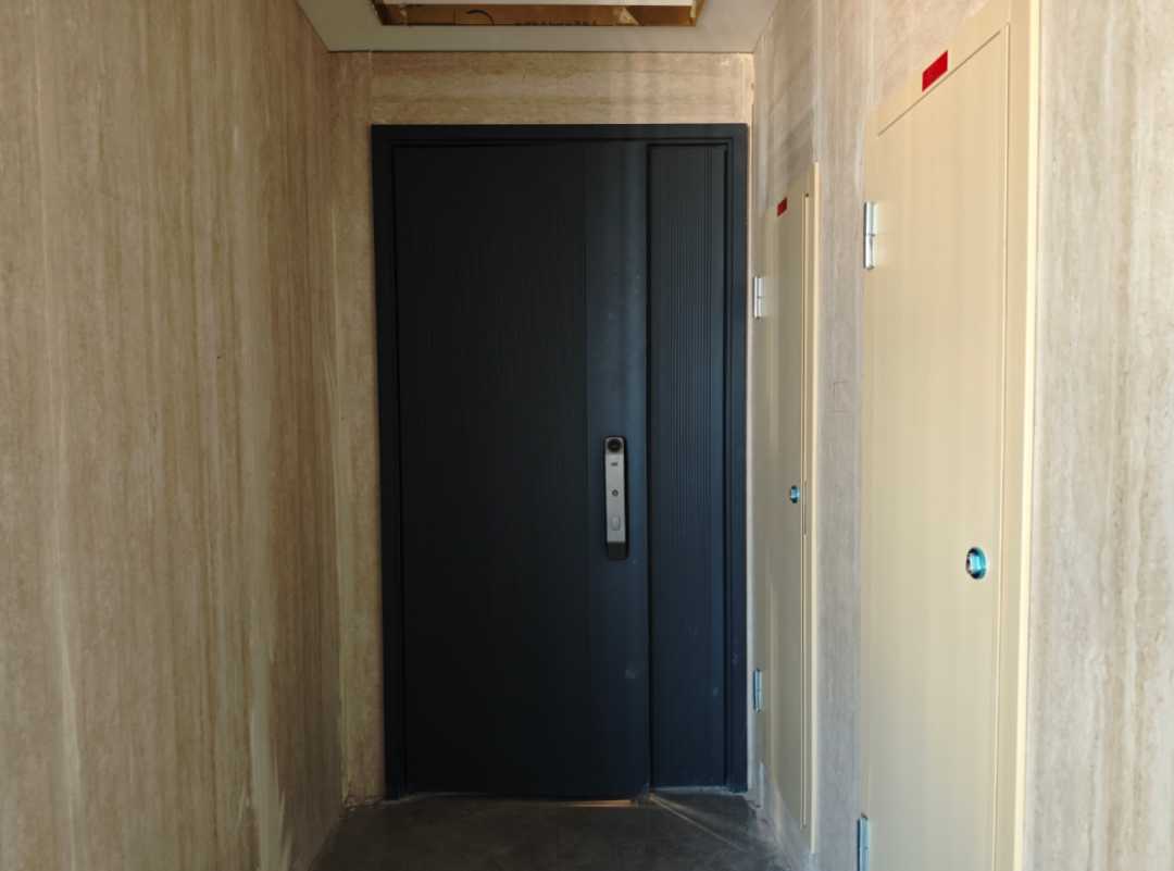 22#~23#楼:入户门、电梯、防火门安装中,工区电梯前室吊顶、地面墙面铺砖中