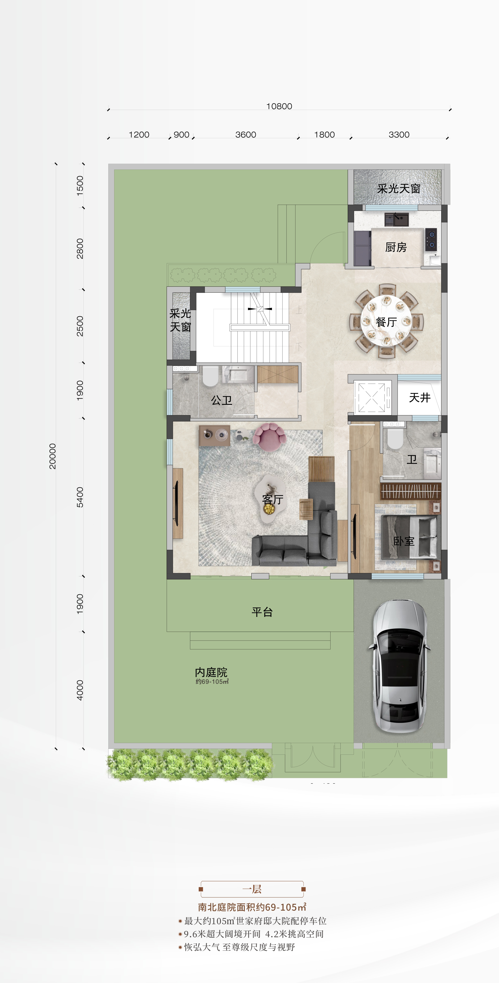 ✅一楼4.2米挑高,雍容大气,带前后庭院、超大院子69-105㎡全赠送,院内专属车位,尽享私密;