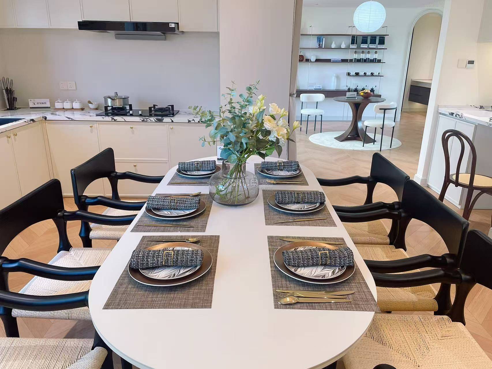 客厅与餐厨空间一体相连,形成开阔通透的生活主场。南北向通透设计,不仅延伸了视觉感受,更让阳光与清风常伴左右,构成家人团聚、友人畅谈的理想场景。