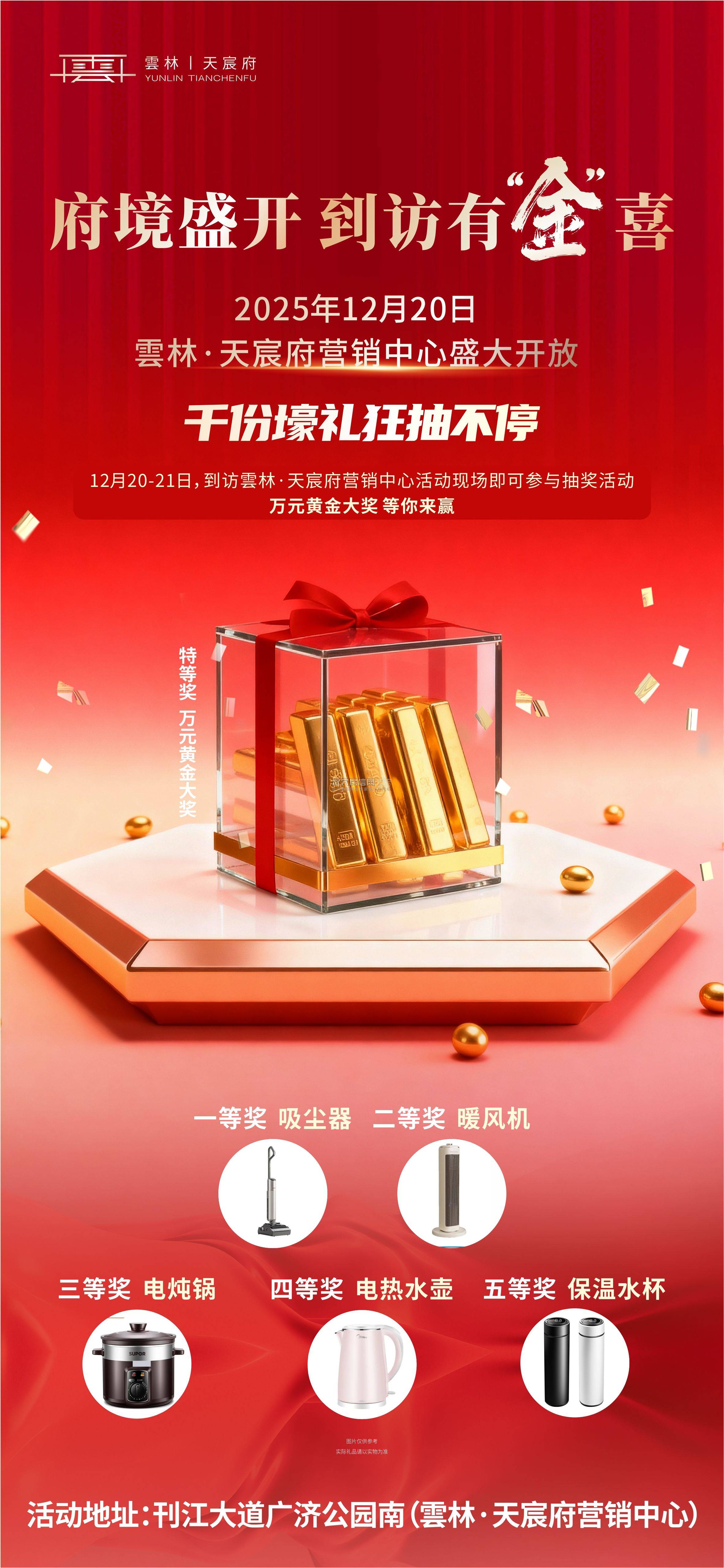 12月20日至21日,只要莅临雲林·天宸府营销中芯,即可邂逅属于您的幸运时分。现场备有上千份心意好礼,从品质家电到日常美物,覆盖生活点滴;更设令人心动的“黄金彩蛋”,静候锦鲤开启。