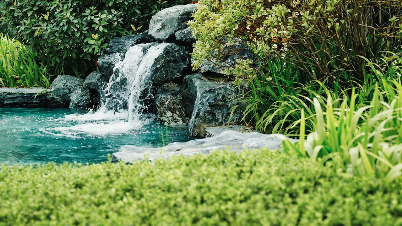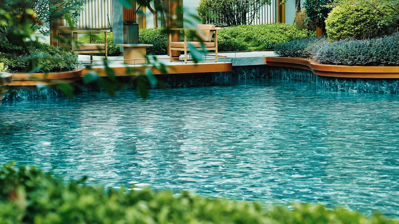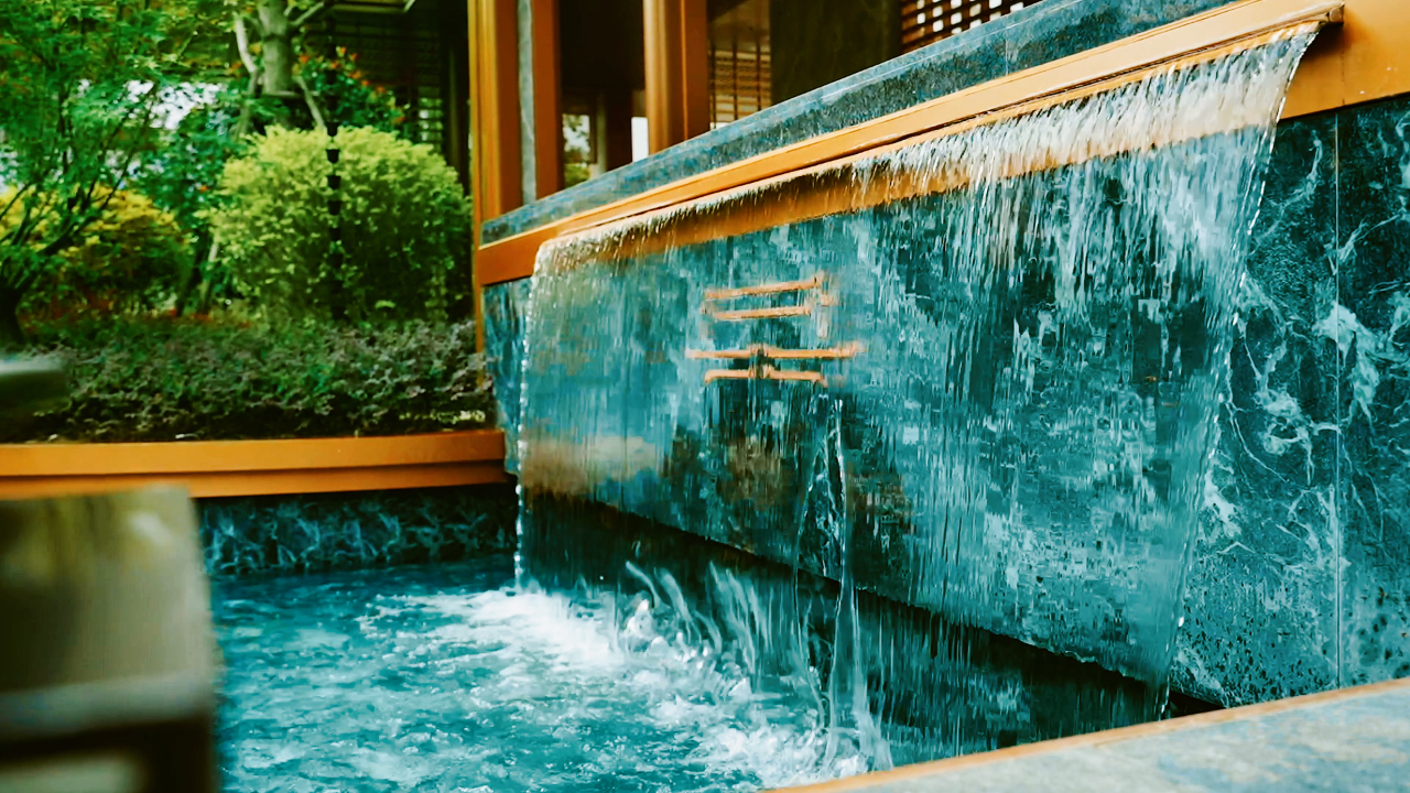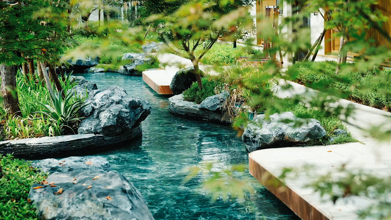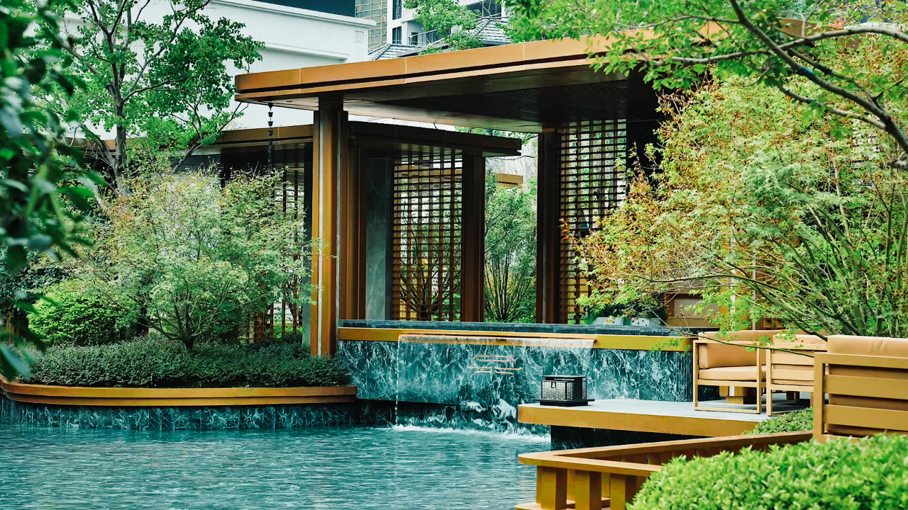 高大乔木遮荫与水景飞瀑形成动静结合的视觉层次。林间在座椅、光影的点缀下,自成一方奇妙天地。