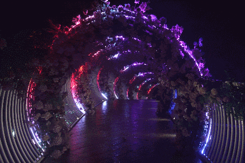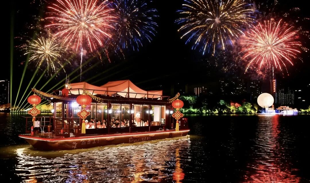 花灯装点的花船在河道缓缓划过,与岸边夜景融为一体,宛如梦境;