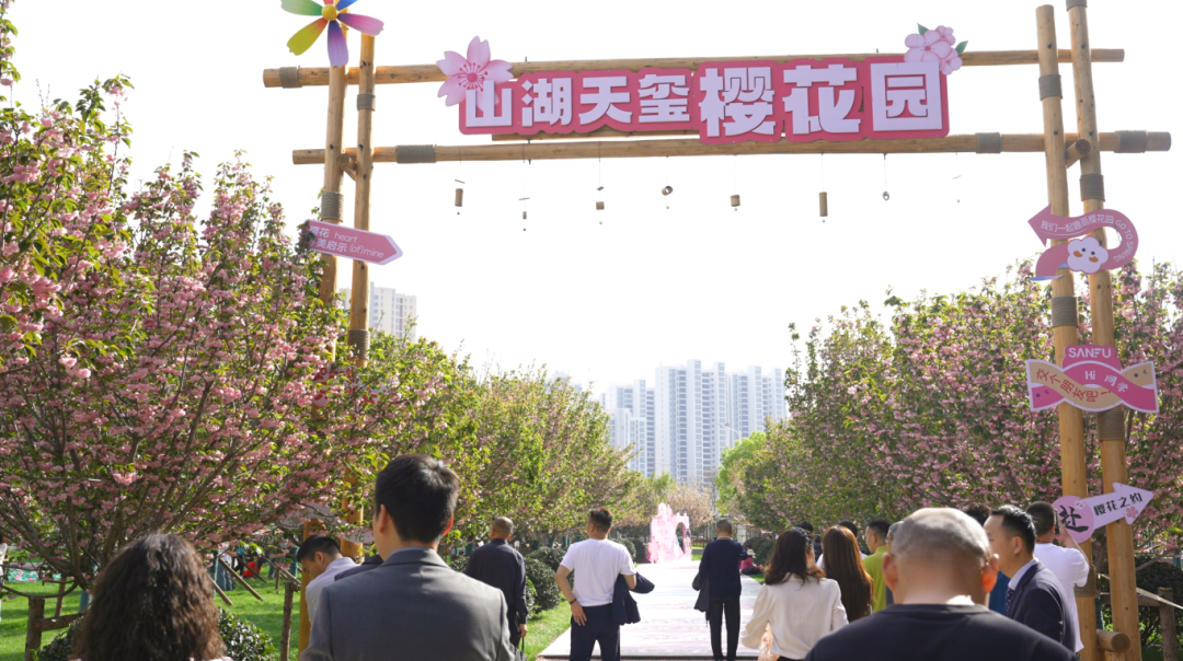 接着,一行人移步园区网红景观打卡点——樱花园,近距离观赏园内 100 余株盛放的关山樱,繁花满枝、景致怡人,大家驻足观赏、拍照留念,沉浸式体验公园式园林的春日美学意境。