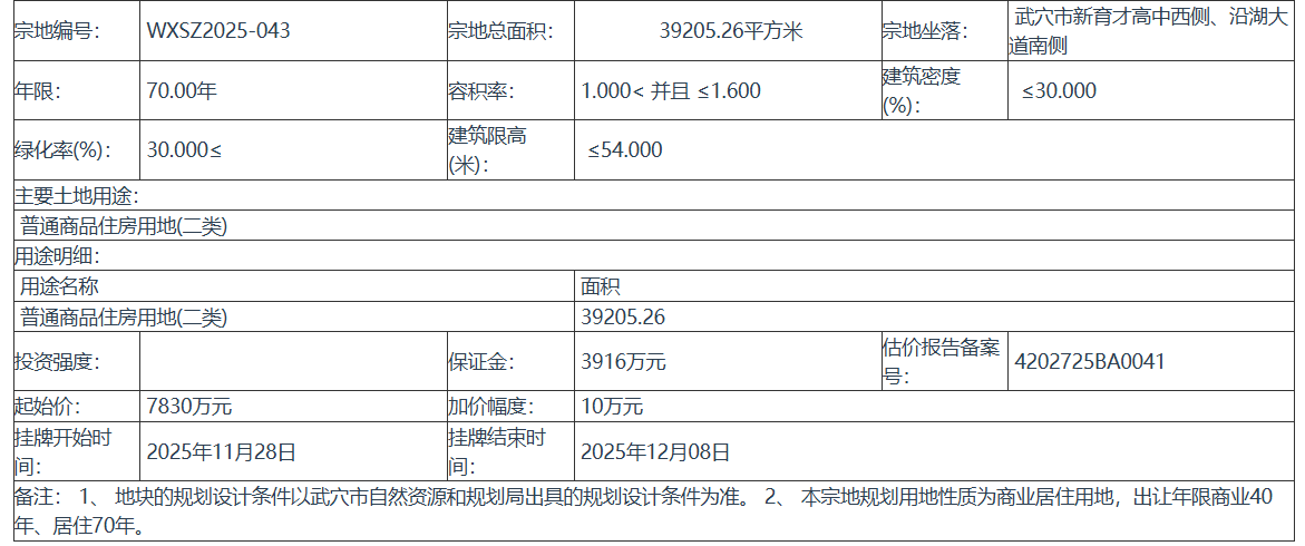 WXSZ2025-043 号地块:2025年11月28日 08时00分 至 2025年12月08日 15时00分;