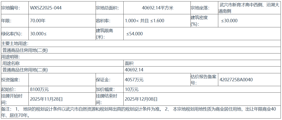 WXSZ2025-044 号地块:2025年11月28日 08时00分 至 2025年12月08日 15时00分;