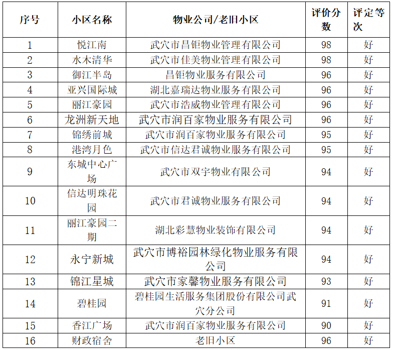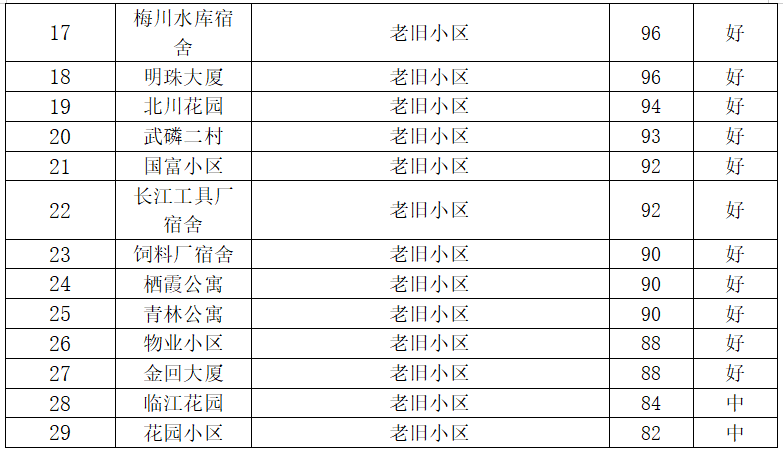 为全面提升街道小区治理现代化水平,解决居民群众反映强烈的小区服务痛点难点问题,进一步加强物业服务企业、老旧小区监管,切实提升辖区内小区管理服务水平,根据《武穴街道小区治理提档工作实施方案》相关要求,“以规范管理、提质增效、群众满意”为目标,由街道社区、业委会(物管会)、业主代表“三方”对物业服务企业和老旧小区进行评价。本周共对辖区内29个小区进行检查,现将评价情况公布如下:
