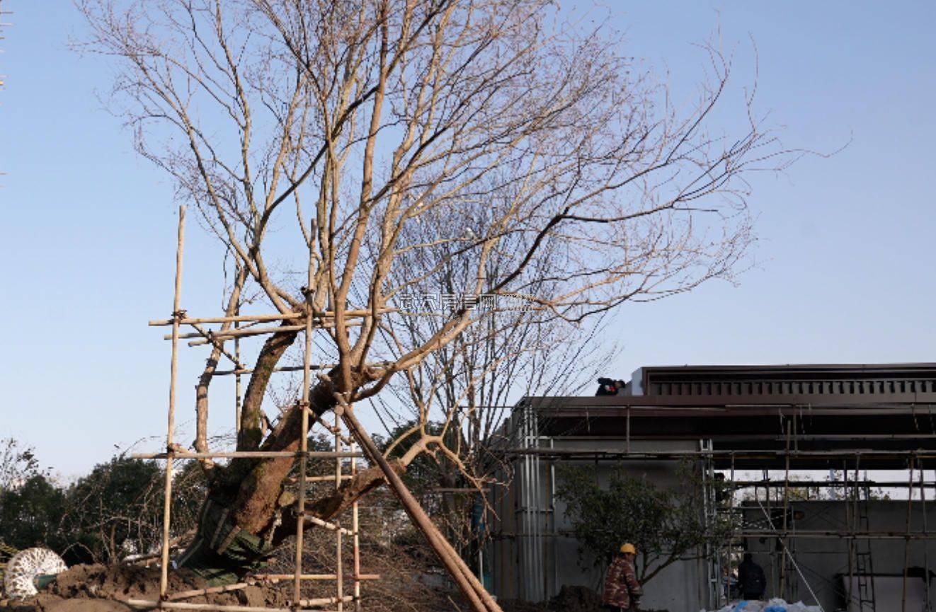 此次,移栽到下沉式庭院会所的古树就是团队远赴安徽乌桕之乡筛选树龄50-100年的造型乌桕、丛生乌桕、丛生朴树、紫薇等,其中乌桕树王树干苍劲、气场雄浑,纵意舒展,在武穴极为罕见。