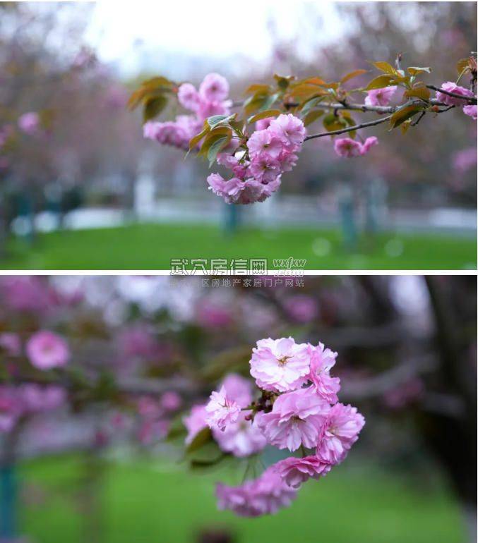 园内一百余株晩樱竞相舒展花枝、次第绽放,一路繁花压枝,顺着河岸线铺展,形成绝美的滨水樱廊。